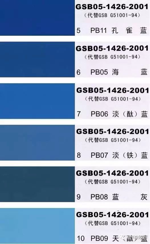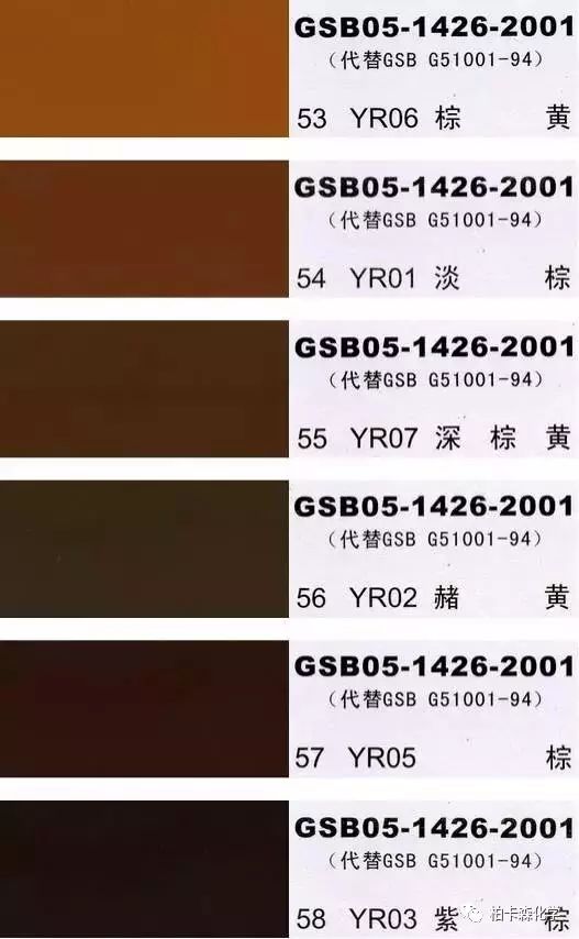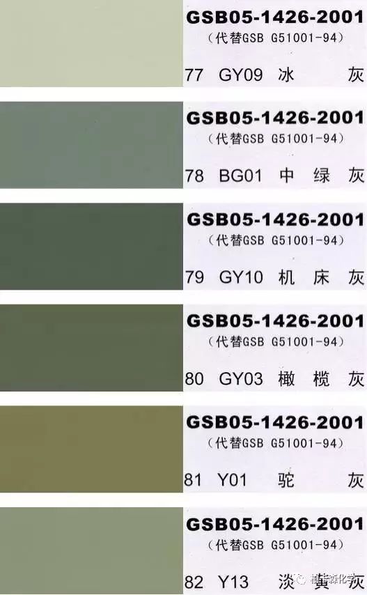 GSB05-1426-2001;全國涂料和顏料標(biāo)準(zhǔn)化技術(shù)委員會(huì)修訂,含83種顏色,光面效果。每個(gè)顏色都有國家統(tǒng)一標(biāo)準(zhǔn)的編號(hào),適用于油性涂料方面使用。